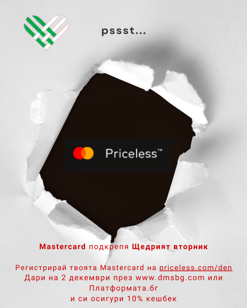 🎯 Тази година има допълнителен стимул за дарителите – включете се в инициативата на Mastercard, която на 2 декември ще осигури 10% кешбек за всички, които дарят през DMS или Платформата.бг с регистрирани карти в priceless.com/den